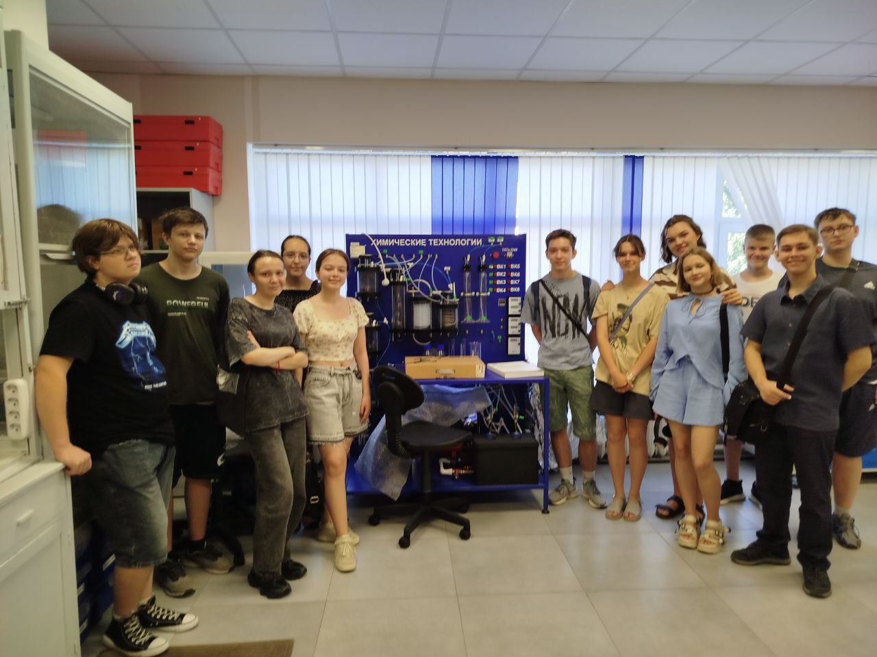 Современная прекрасно оснащенная лаборатория привлекла внимание ребят своим стендом «Химические технологии», на котором выполняются лабораторные работы по изучению механизмов работы реакторов 4 типов (на примере гидролиза ацетилацитатов изучается процесс гидролиза). Стенд подключен к ноутбуку со специальным программным обеспечением, позволяющим наблюдать процесс исследования.