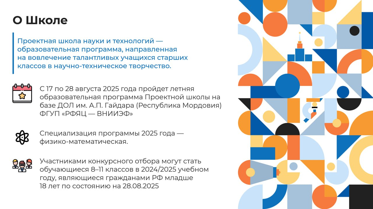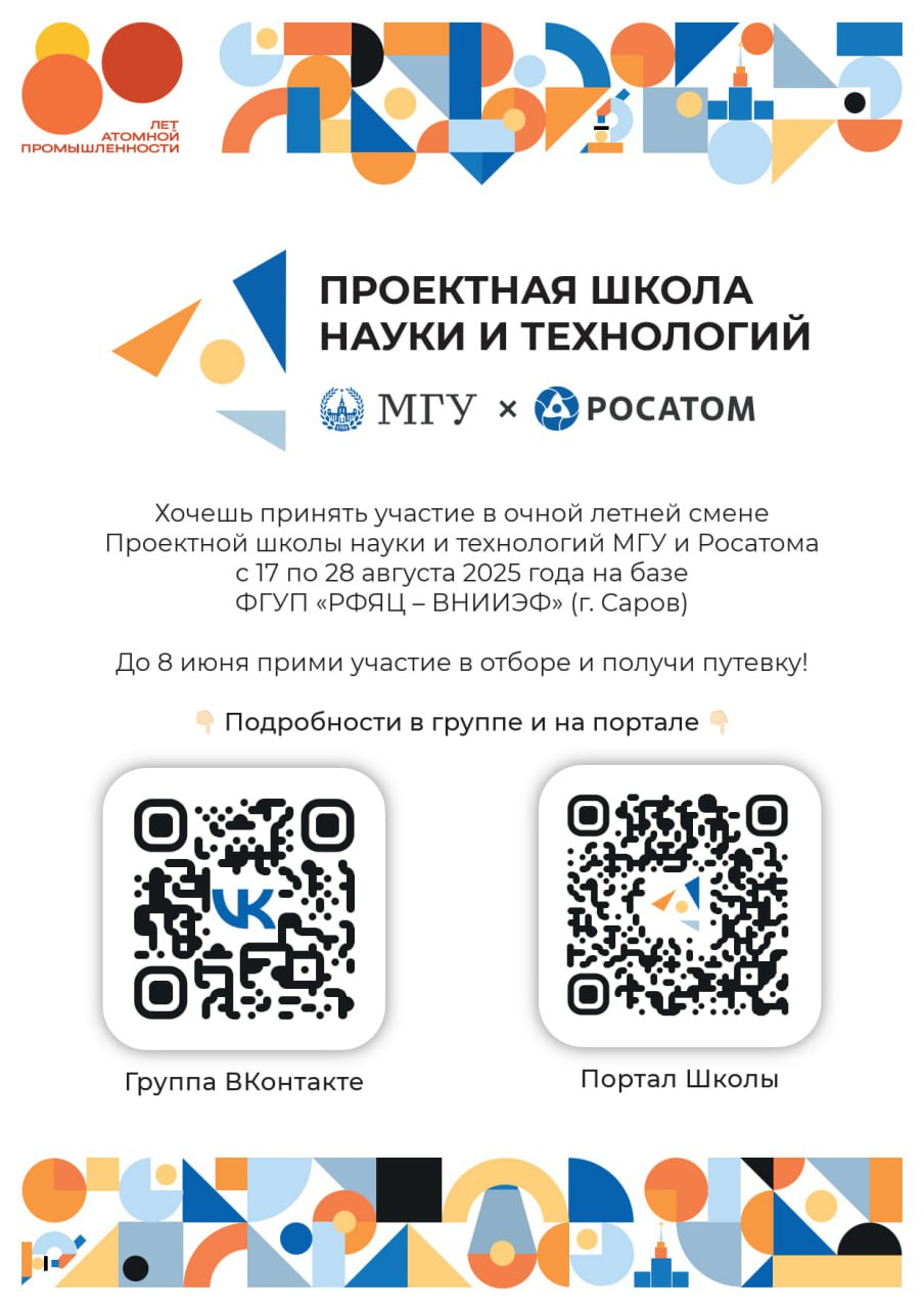 Финалом Проектной школы станет очная образовательная программа, которая состоится с 17 по 28 августа 2025 на базе ФГУП «РФЯЦ – ВНИИЭФ» (г. Саров).
