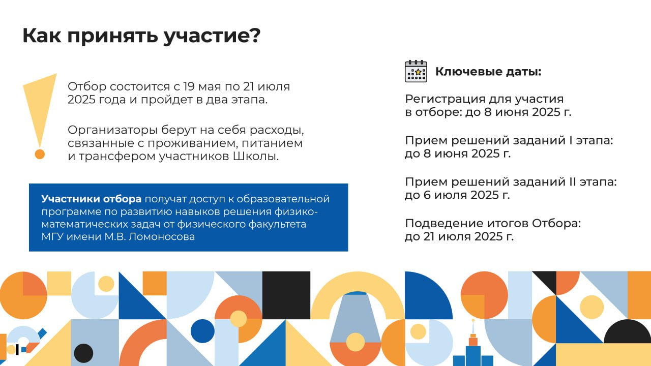 💙Конкурсный отбор участников Проектной школы состоит из двух этапов и включает оценку портфолио и серию конкурсных заданий, направленных на определение уровня предметных знаний по физике и математике, а также компетенций в области проектной деятельности. К участию в Отборе приглашаются обучающиеся, оканчивающие 8–10 классы в 2024/2025 учебном году.